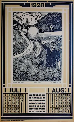 Hartje zomer een houtsnede van Jan Franken op een kalenderblad voor de maanden juli/augustus 1928, dus in ieder geval vervaardigd vóór 1928. Het betreft een kalenderuitgave van Felix Pinechas Abrahamson, boekhandelaar in Amsterdam, geboren in 1870, omgekomen in Sobibor in 1943. Abrahamson gaf jarenlang, naast zijn overige activiteiten, kalenders uit met werk van gerenommeerde kunstenaars als Jan Toorop en Henri Verstijnen, om er maar een paar te noemen. En dus ook van Jan Franken. Het kalenderblad, waarvan ik de ontwerper (nog) niet heb kunnen achterhalen, meet 43x26 cm (hxb), de houtsnede zelf 24x17 cm (hxb).